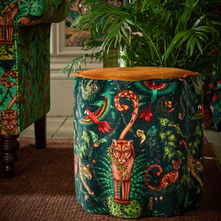 An enigmatic puma commands attention at the heart of the design, surrounded by macaws, monkeys, sloths, and ocelots, each intricately illustrated to evoke a sense of wonder and storytelling. The scene unfolds across a sumptuously soft cotton velvet, where rich colour depth and velvety texture bring each detail to life.