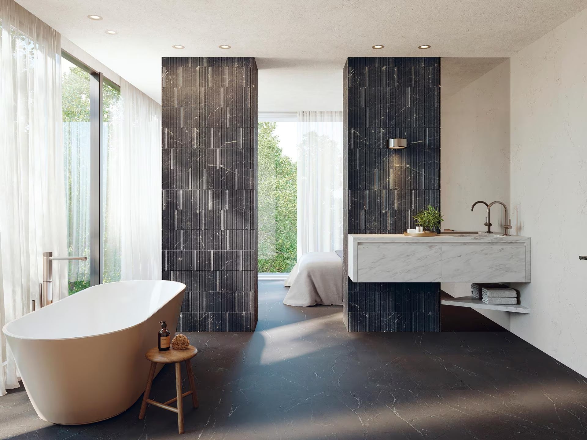 The Brooklyn Marquina tile from Porcelanosa’s New York series brings dramatic sophistication to any interior with its deep black marble aesthetic and subtle veined relief. Offered in an elegant 800×800 floor format with coordinating plain wall tiles and decorative pieces, Brooklyn Marquina pairs beautifully with Brooklyn Fontana to create a timeless black-and-white design palette. Ideal for modern homes and upscale commercial spaces, this series delivers a bold yet refined architectural statement with lasting visual impact.