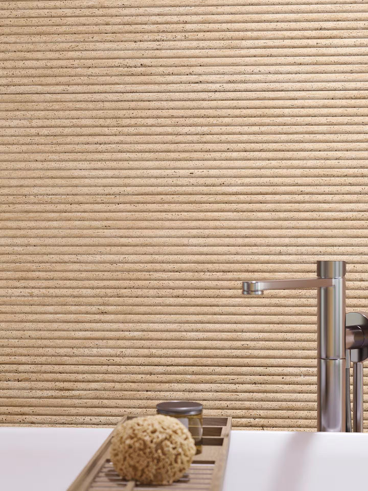 The Canal Taranto Gold decorative tile adds a luxurious sculptural element to the Taranto collection, featuring refined concave and convex linear relief that enhances the warm golden undertones and natural travertine-inspired veining of the range. Crafted in Spain from premium porcelain, this 596×1500mm feature tile introduces depth, movement, and architectural elegance to bathrooms, kitchens, and modern living spaces. Designed to pair seamlessly with the matching Taranto Gold floor and wall tiles, Canal Taranto Gold creates a cohesive, high-end interior finish. Durable, low maintenance, and visually striking, it’s an exceptional choice for New Zealand homes and commercial projects seeking a sophisticated, textured travertine look.