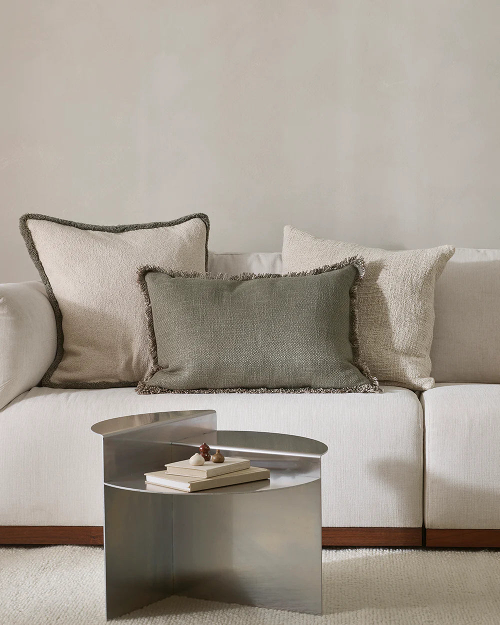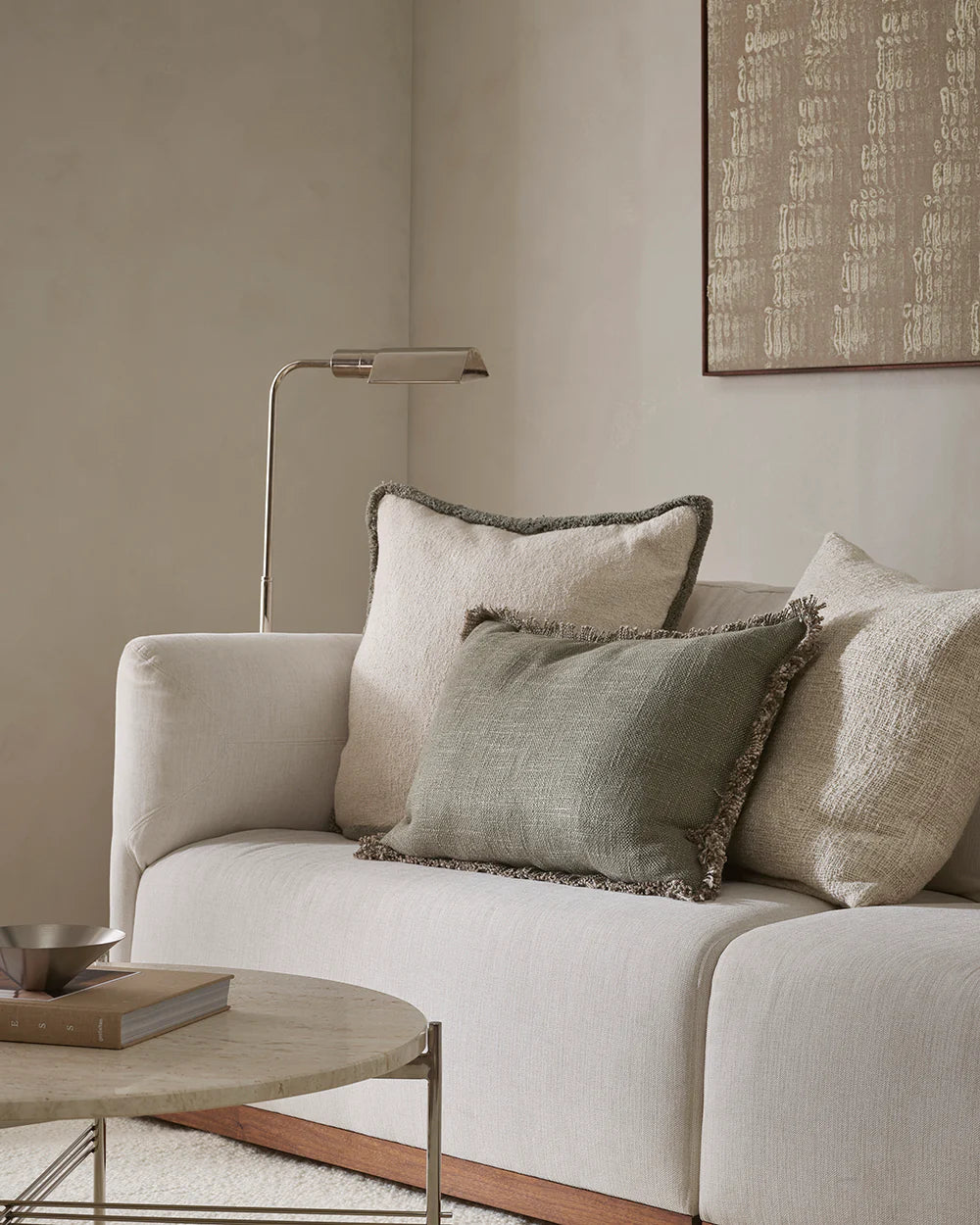 Crafted from a thoughtful blend of cotton, recycled polyester, and linen, this cushion offers durability with a soft hand-feel, while its textured bouclé weave and statement fringe detail make it a standout accent piece.