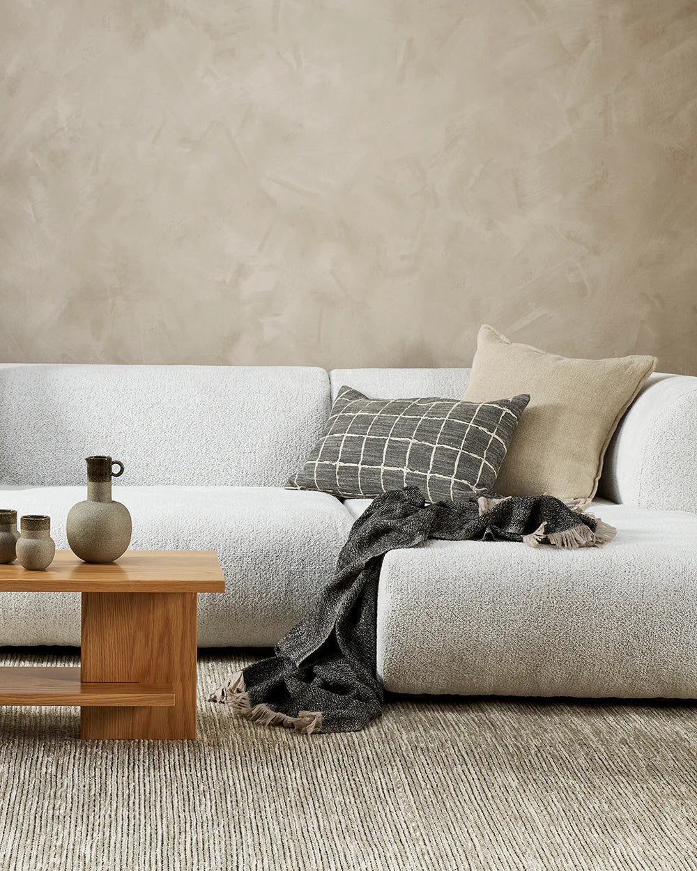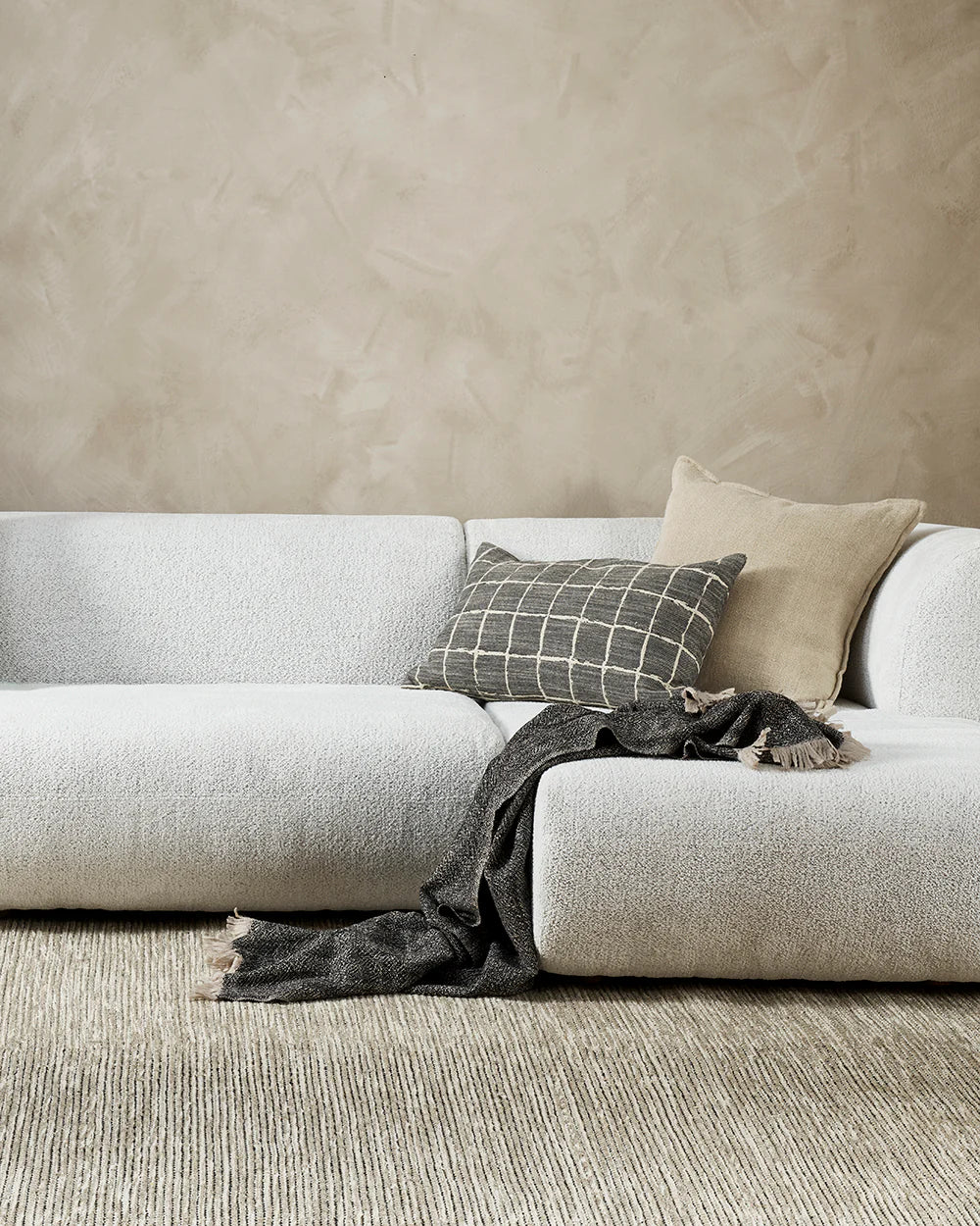 In a warm take on monochrome, classic country style is reinterpreted with a refined and elegant aesthetic. Featuring a ragged grid design in finely woven reverse fabric, the Johnson cushion’s lumbar shape in an ecru and black palette creates a composed and considered space for living.