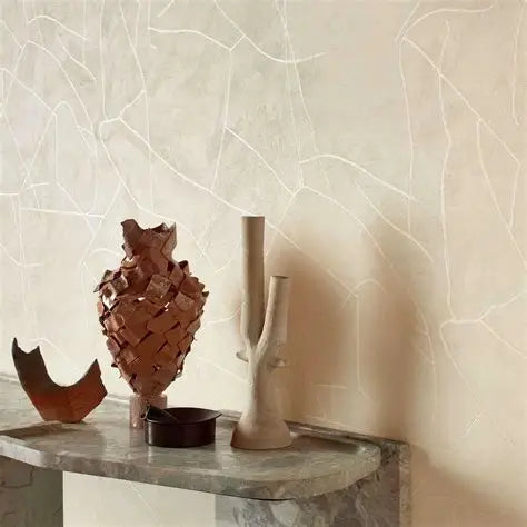 Crafted in France and distributed in New Zealand through Seneca, the Kintsugi range embodies a dialogue between raw materiality and refined artistry. Uneven metallic lines shimmer softly over matte plaster tones, bringing warmth, texture, and sophistication to any interior setting.