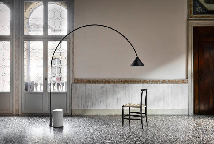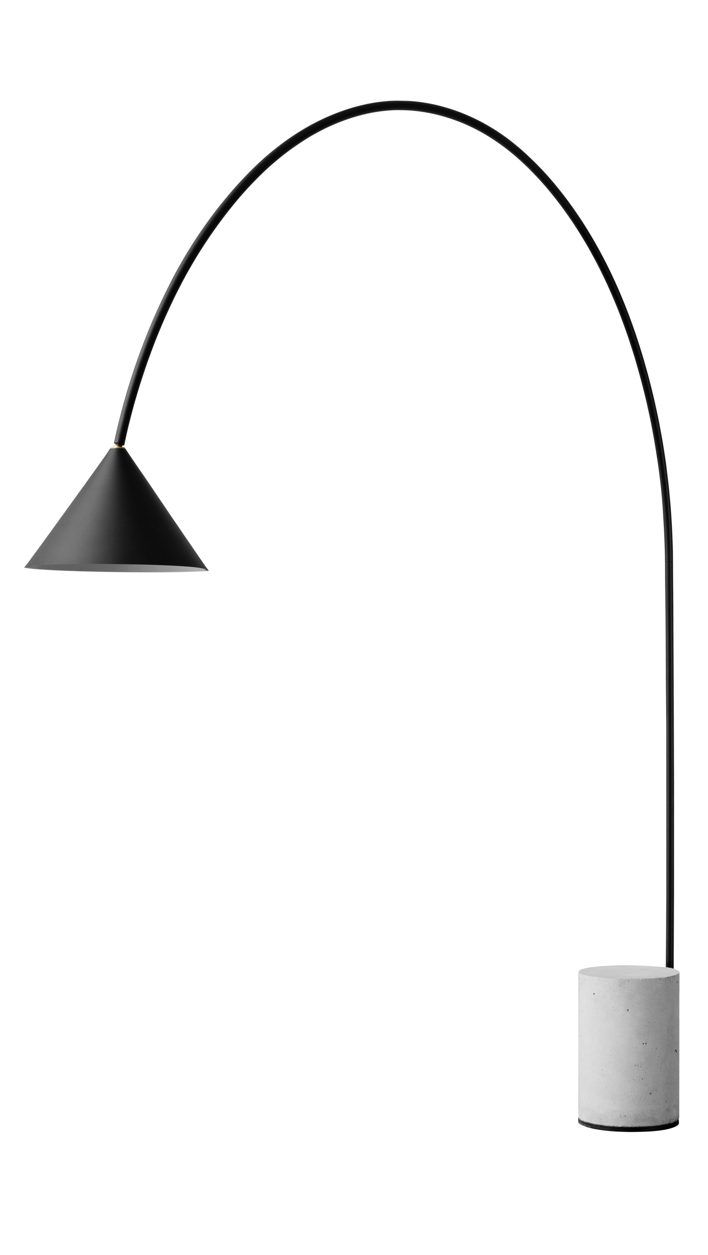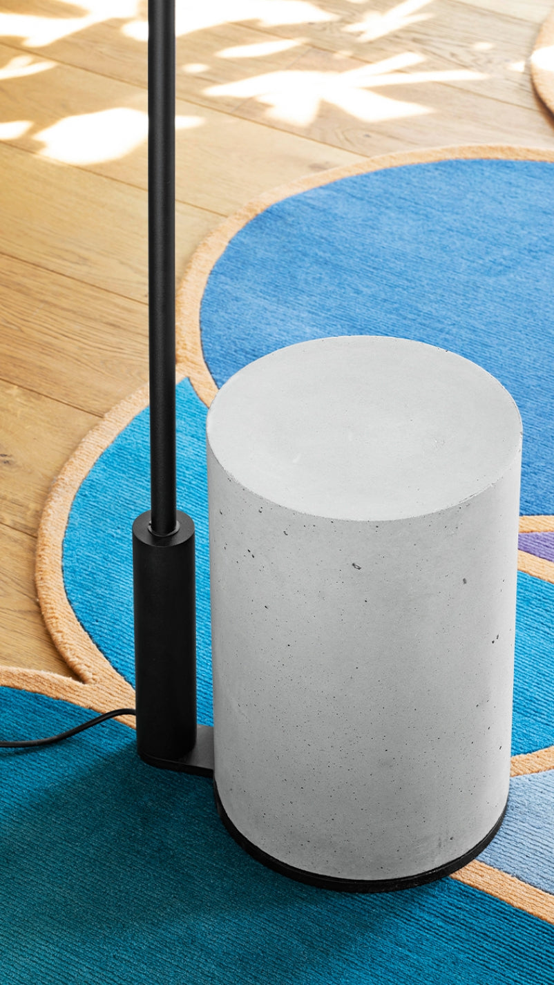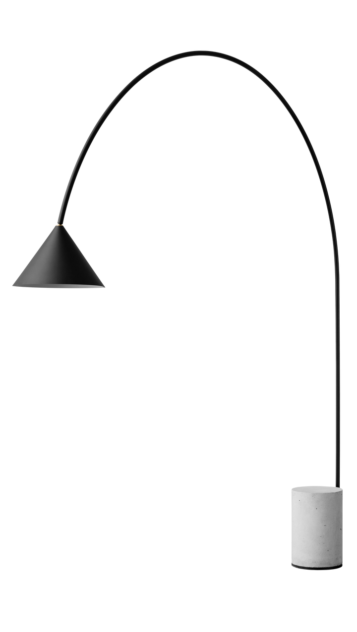 Its design begins with a solid concrete base and extends in a graceful arc that culminates in a suspended lampshade — a dialogue between weight and weightlessness, form and function. The result is a floor light that feels architectural yet poetic, effortlessly balancing industrial honesty with sculptural refinement.