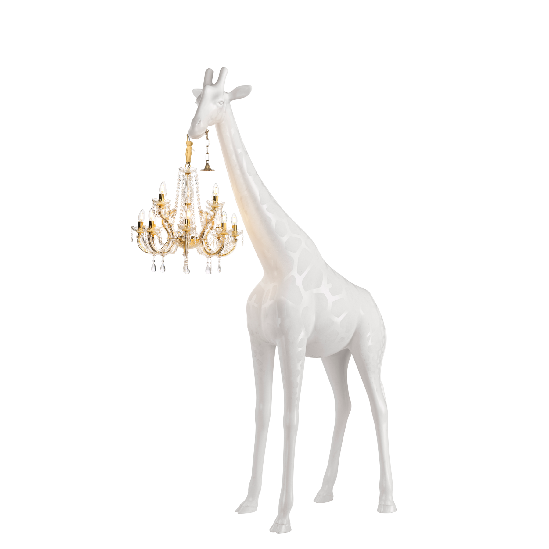 Designed by Marcantonio, Giraffe in Love M Indoor is a giraffe that holds a classic Marie-Thérèse style chandelier, 2.65 meters high, a dimension that allows it to step into everyone's homes. Bold and elegant she is naturally gonna be the centre of attention of any living room.