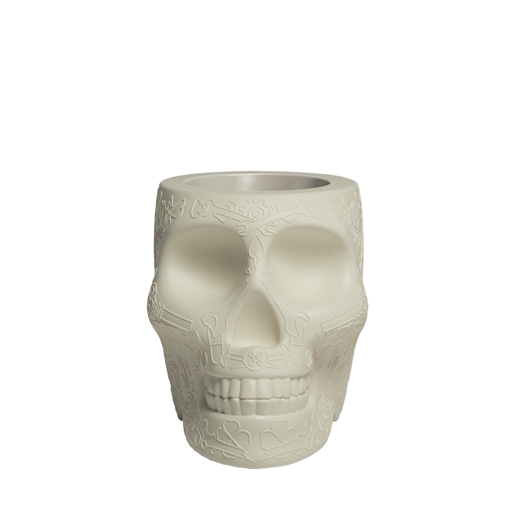 Mexico, designed by Studio Job, is a skull-like design object with a graphic pattern on the surface, functioning both as a planter and champagne cooler. Reminding of the traditional painted skulls from the homonymous country, Mexico is a whimsical reminder of the cyclicality of our presence on Earth, to exorcise death and celebrate life. Perfect for lounge areas, dining rooms and outdoors spaces.