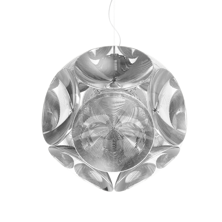 Twelve concave polycarbonate discs are aggregated around a fulcrum, ensuring optimal light diffusion, which gives a rich atmosphere to the space in which the lamp is positioned.