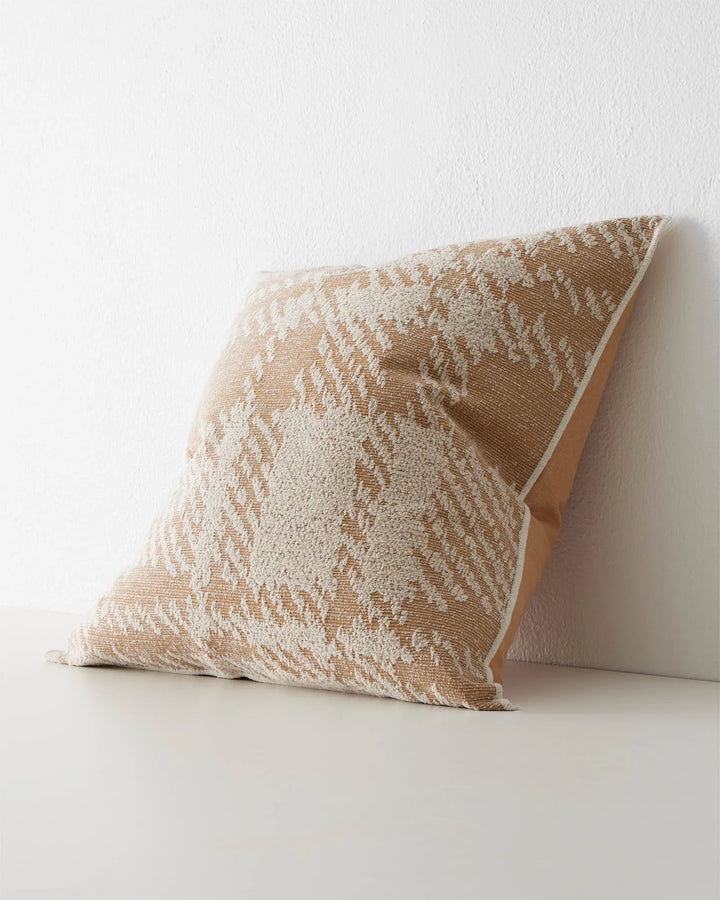 The Sienne Cushion showcases an oversized check design with texture that enhances its sophisticated appeal. Made from a durable blend of 42% cotton, 34% recycled polyester, 15% linen, and 9% viscose, it offers both luxury and sustainability.